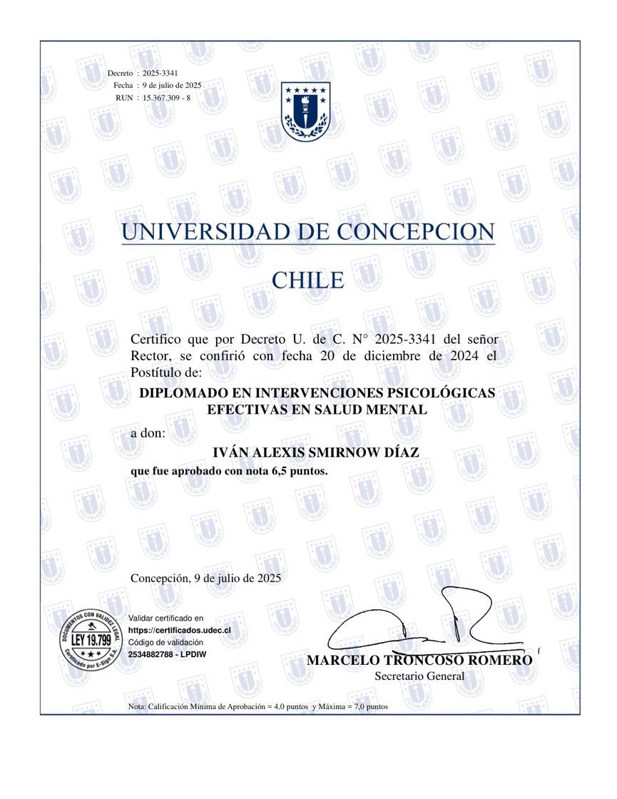 Hola, soy Iván Smirnow, Psicólogo Clínico. Trabajo con adolescentes, jóvenes y adultos que buscan un espacio seguro para comprender lo que están viviendo, recuperar bienestar emocional y fortalecer su identidad personal e interpersonal.